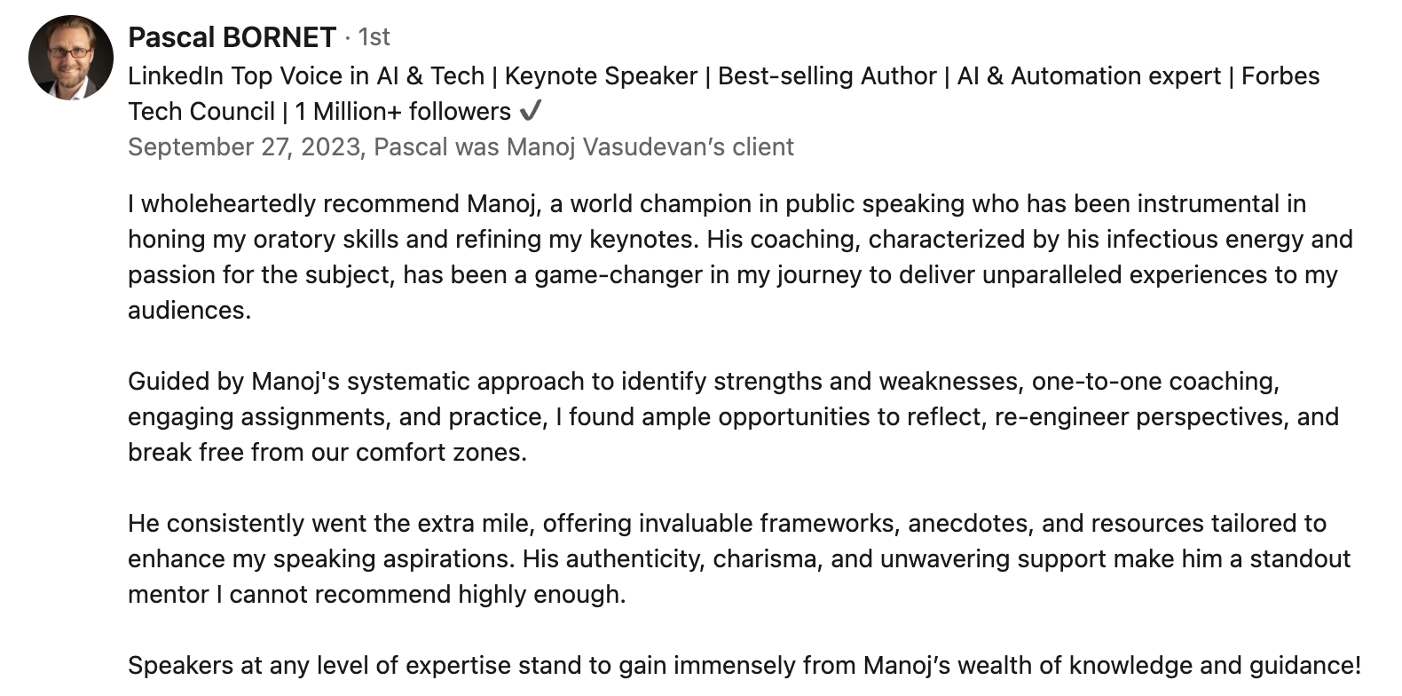 Manoj is a fantastic friend, passionate on many topics which make him a well-rounded coach and speaker as well as a true inspiration for others. I have had the chance to work with him for a few years and he is always making time to listen and coach you to be better at whatever you want and maximize your real potential. Every opportunity to meet Manoj on a personal basis is a chance to speak, listen and learn. I can recommend Manoj if you require a coaching whether it is for business or speaking in public or if you simply need guidance to get the best out of you!