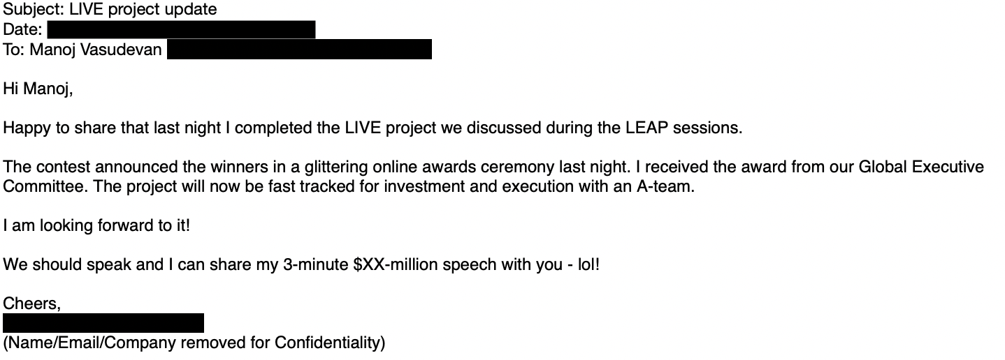 Manoj came across as a very sincere person and takes genuine interest to want to help people he meets to bring them to their next level of their career/success. Before joining the LEAP programme, I was searching for ways to assert my executive presence at the workplace and to close the gaps in terms of my skillsets in order to move up the corporate ladder. The LEAP programme created new awareness for me and provided a structured step-by-step guide to help me work on these areas.