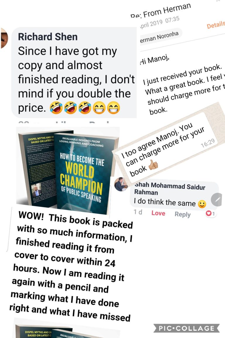"WOW! This book is packed with so much information, I finished reading it from cover to cover within 24 hours. Now I am reading it again with a pencil and marking what I have done right and what I have missed in my Toastmasters’ journey. If you are planning to be a speech contestant or just want to deliver a speech that touches hearts, you should get hold of this book. In this book, Manoj provides step by step instructions that makes it easy for you.